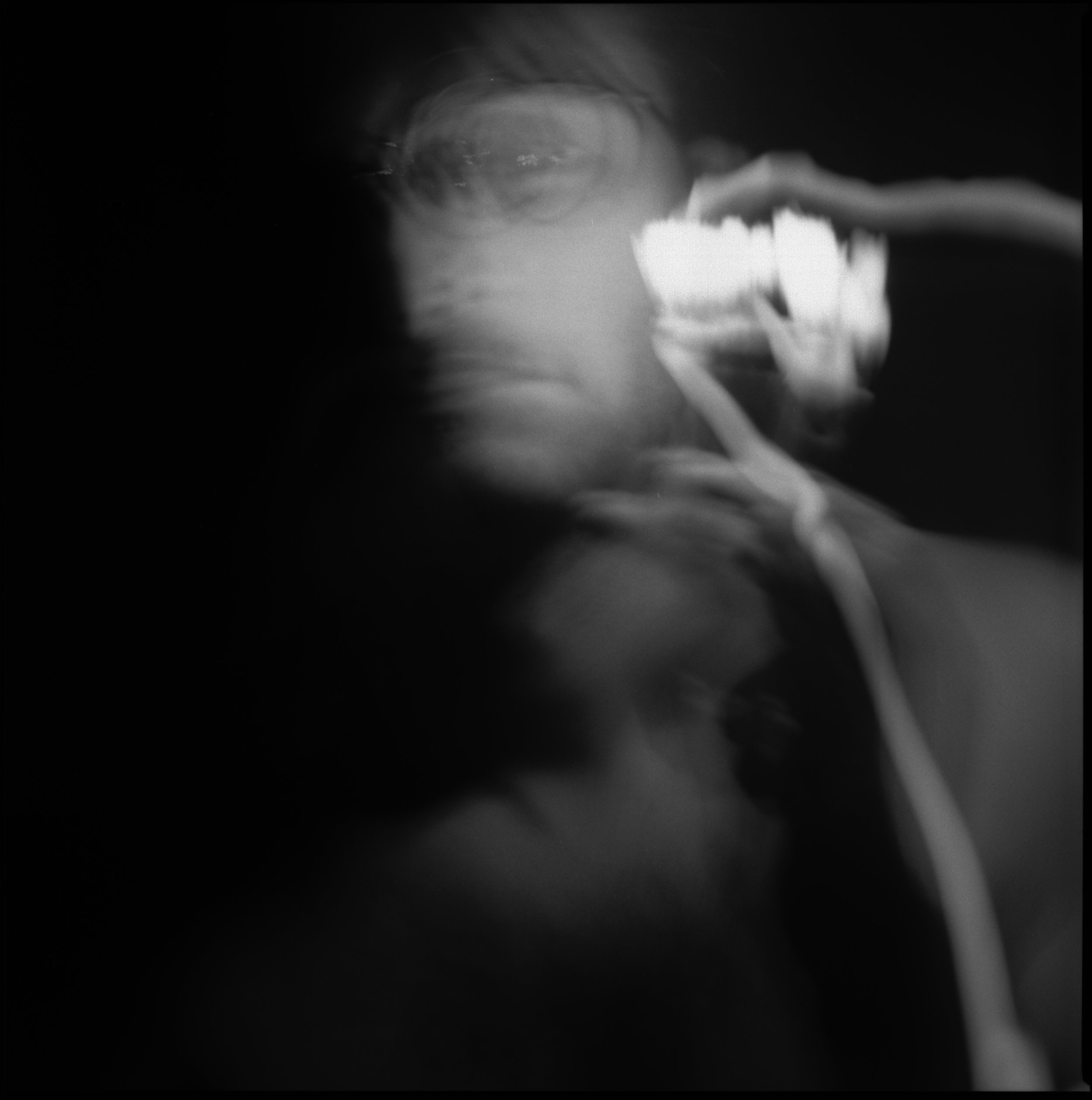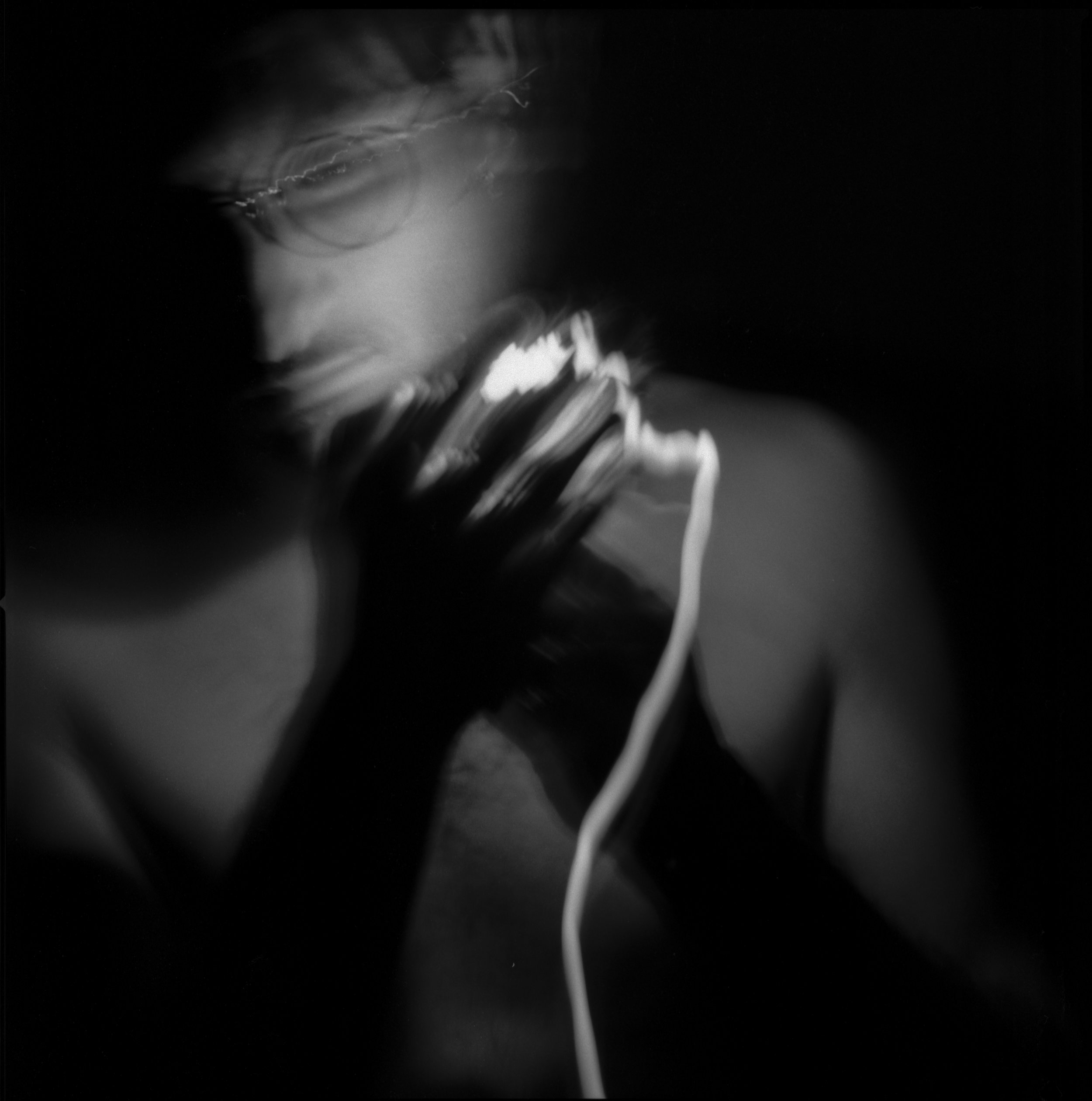 What is photography, especially black and white photography, but chiaroscuro? I wanted to locate the medium within the theme. That is, to ask the question again: what does a photograph contain other than light and shadow? Or, what are the conditions of representing light and shadow in a photograph? For me the answer was time—the aim to make visible the relation between time and light and shadow. The only source of light in the photographs is the small wax candle visible in the frame. Over time, between 60 and 120 seconds, the light reflects the body, creating form. In the space of the exposure, the body trembles, the wind blows, the photograph reflects time.